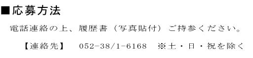 | 勤務地 | 本社工場 または 第二工場 ・本社工場 : 愛知県名古屋市中川区東起町4-1-1 ・第二工場 : 愛知県名古屋市中川区東起町4-136 |